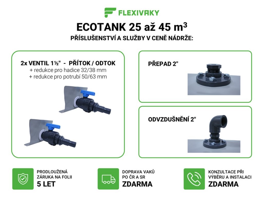 Na přání můžeme flexibilní nádrž vybavit IN/OUT ventily, přepadem a odvzdušněním různých velikostí a průtoků v závislosti na vašich potřebách. Doporučené náhradní příslušenství naleznete dole mezi Souvisejícími produkty nebo v kategorii Náhradní příslušenství