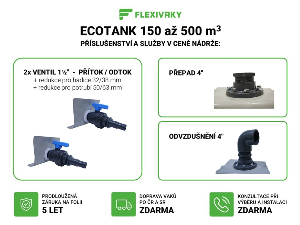 Na přání můžeme flexibilní nádrž vybavit IN/OUT ventily, přepadem a odvzdušněním různých velikostí a průtoků v závislosti na vašich potřebách. Doporučené náhradní příslušenství naleznete dole mezi Souvisejícími produkty nebo v kategorii Náhradní příslušenství